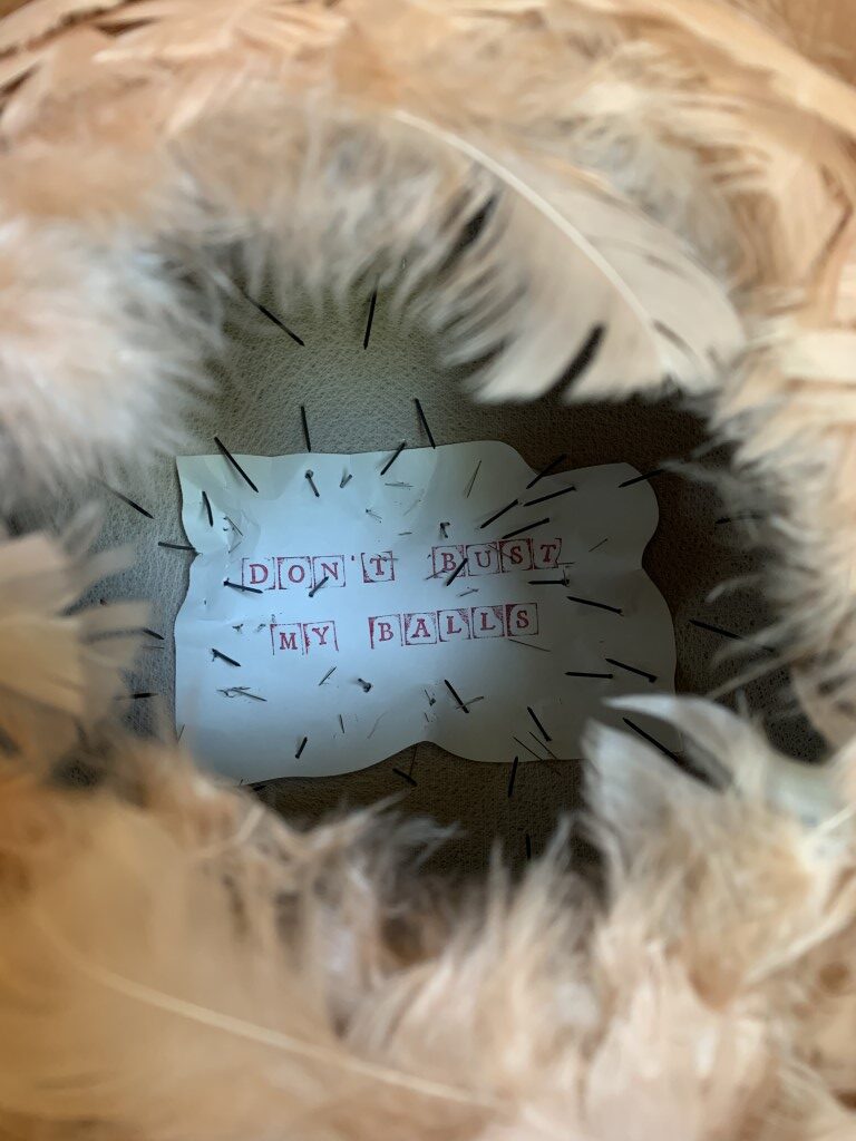 sfera diametro 35cm struttura in corda ricoperta da piume , carta, spilli